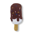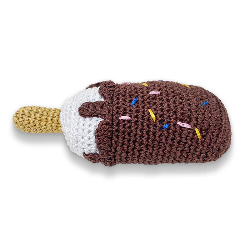 Chocolate Pop designed crochet toy. High quality handmade crochet dog toy with squeaker inside. Interlaced with hard cotton thread, designed to be durable, and flexible. It improves dental health by removing deposits of all the calculus while having fun. Toy measures about 4'' long.